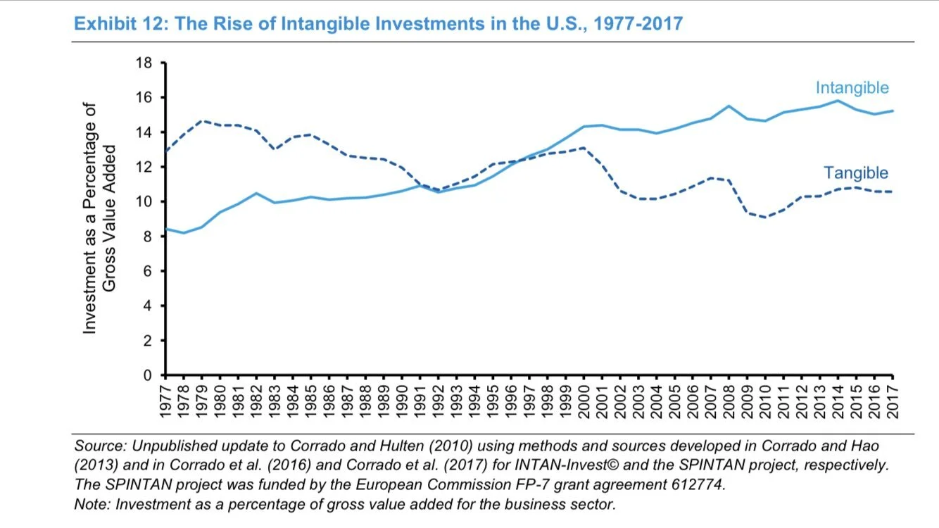 Thus, we were intrigued by a recent Sparkline Capital paper (here), which argued value investing’s underperformance can largely be explained by disruption caused by intangible capital, particularly business models and organizational designs based on technological innovation.