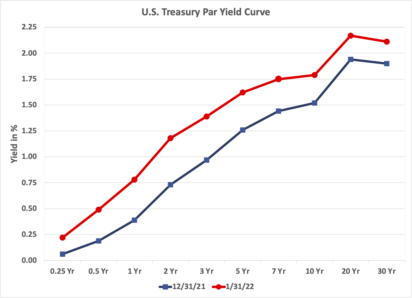 In January, interest rates spiked across the yield curve, even at the short end. In its January 26, 2022 press release, the Federal Open Market Committee (FOMC) stated “With inflation well above 2 percent and a strong labor market, the Committee expects it will soon be appropriate to raise the target range for the federal funds rate. The Committee decided to continue to reduce the monthly pace of its net asset purchases, bringing them to an end in early March.”