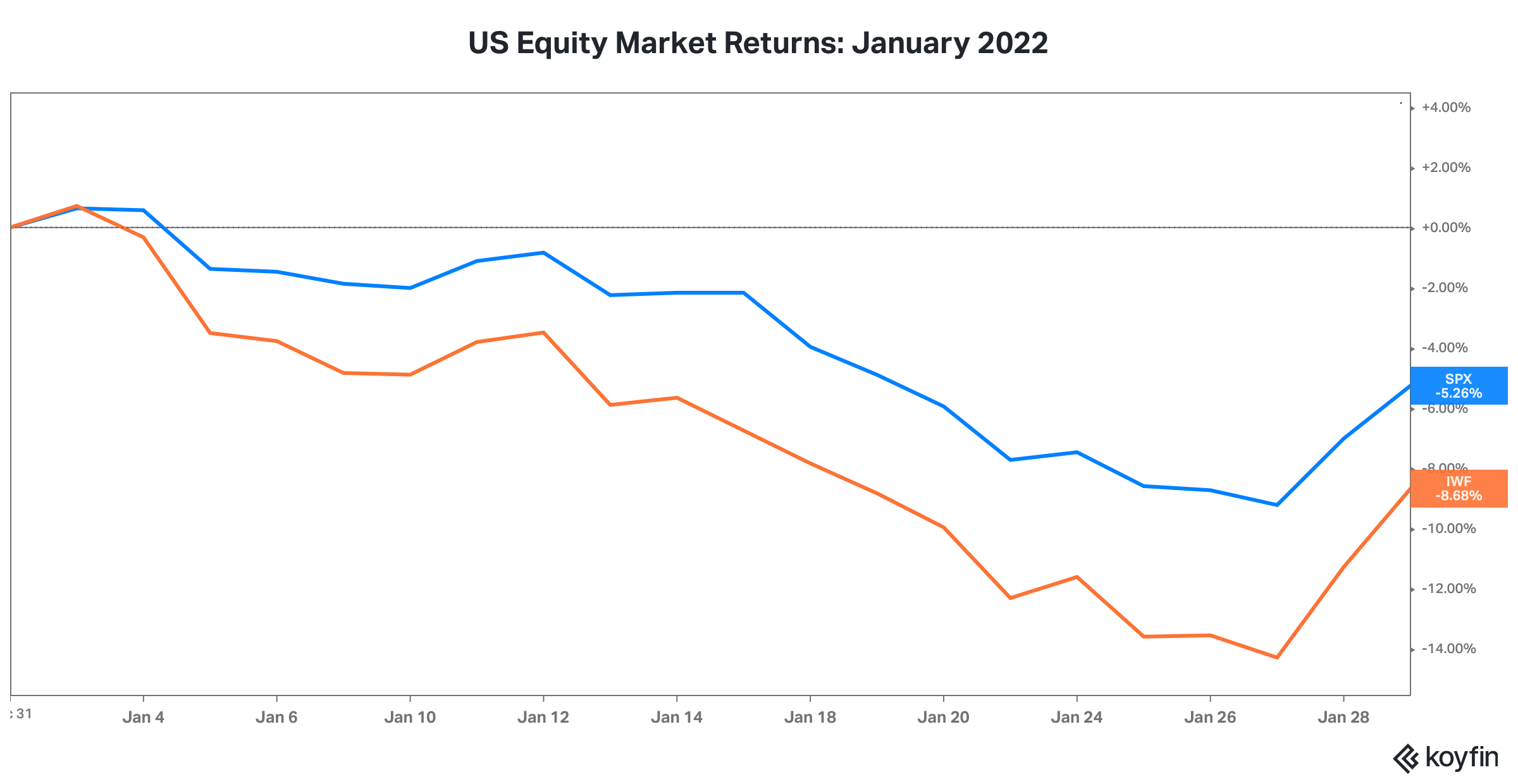 This chart shows the January 2022 returns of the S&P 500 Index (ticker SPX, in blue) and the iShares Russell 1000 Growth ETF (ticker IWF, in orange).