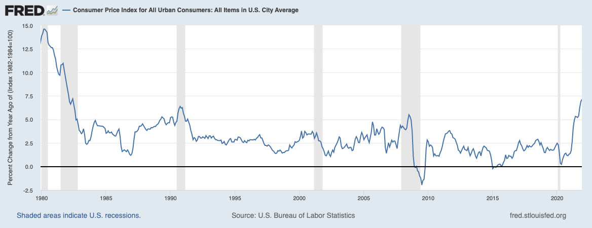 As measured by the Consumer Price Index for All Urban Consumers, prices increased 7.1% year over year in December 2021. The last time the US economy faced such price pressures was the late 70’s / early 80’s when I was a young teenager and gasoline had to be rationed.